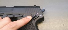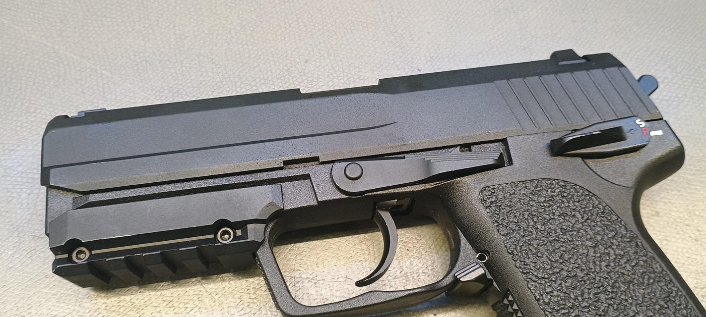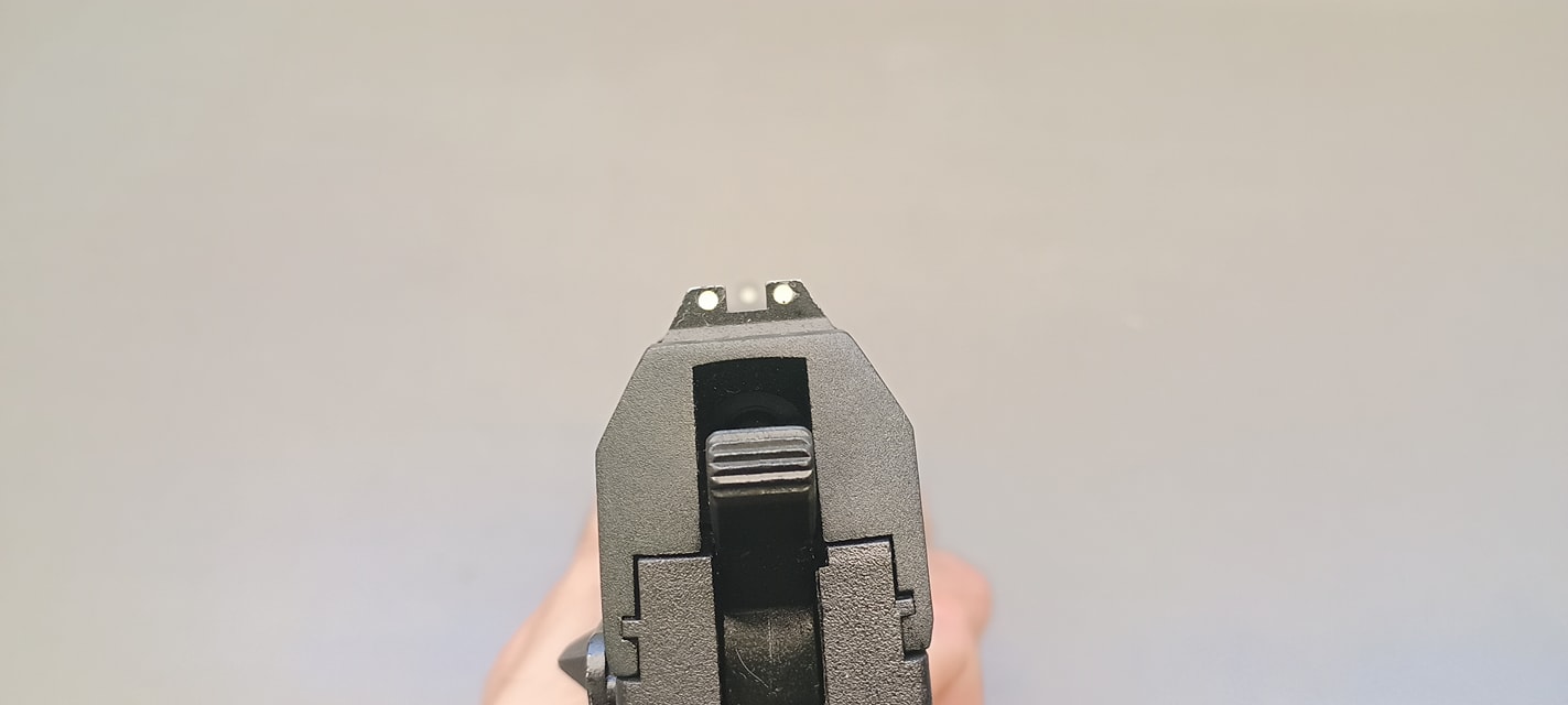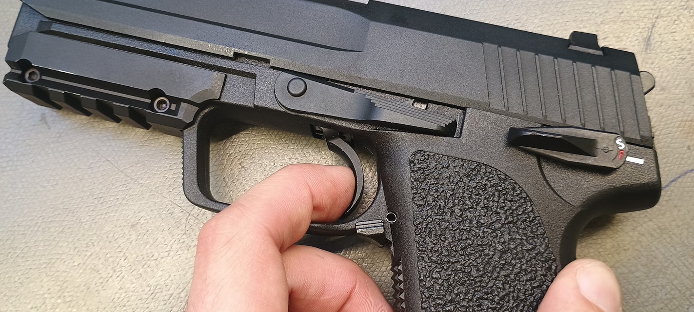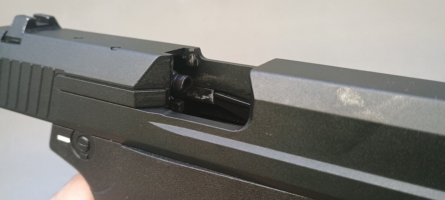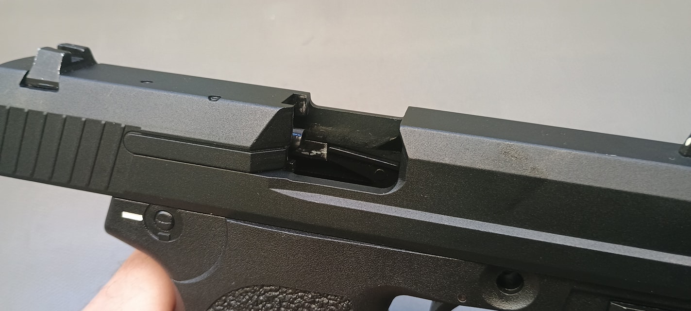And then there's the trigger. On one hand, it's surrounded by an uncomfortably large trigger guard. I guess this can be attributed to the fact that German men are bigger (at least their hand :D ) so the trigger guard had to be enlarged. Also, the guard may be bigger because of the idea of glove use. The other thing is that the trigger itself is made of very little material, so unfortunately it breaks regularly. This breakage can occur because you can pull the trigger in a strong manner, it doesn't stop at a barrier, so you can keep stretching the material itself - then it suddenly snaps off on the right side. Finding a replacement part is borderline impossible – you either order a TM HK45/USP steel replacement part, or maybe a TM factory part, or you have to contact SRC directly to buy from them. Unfortunately, TWG usually treats it as a non-warranty failure, so the replica has a chance to land in the trashbag after „a little squeeze”. Interestingly, it hasn't broken for me so far, as I carefully „dance” around the firing pin - I don't wait for the reset of the trigger, instead I release it back immediately with a characteristic bouncing motion.