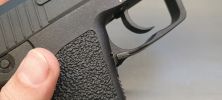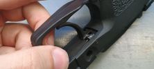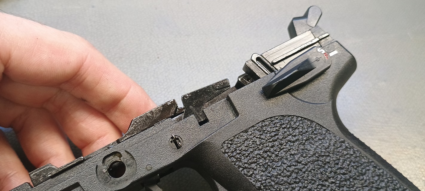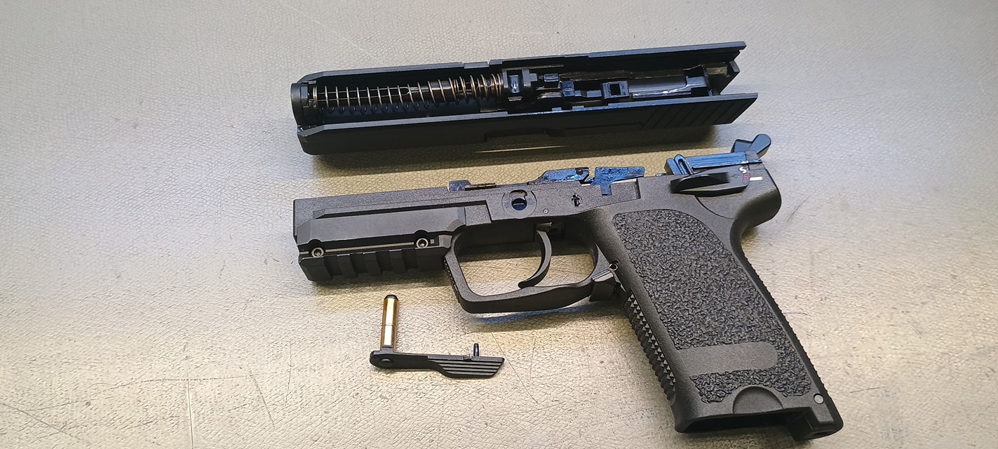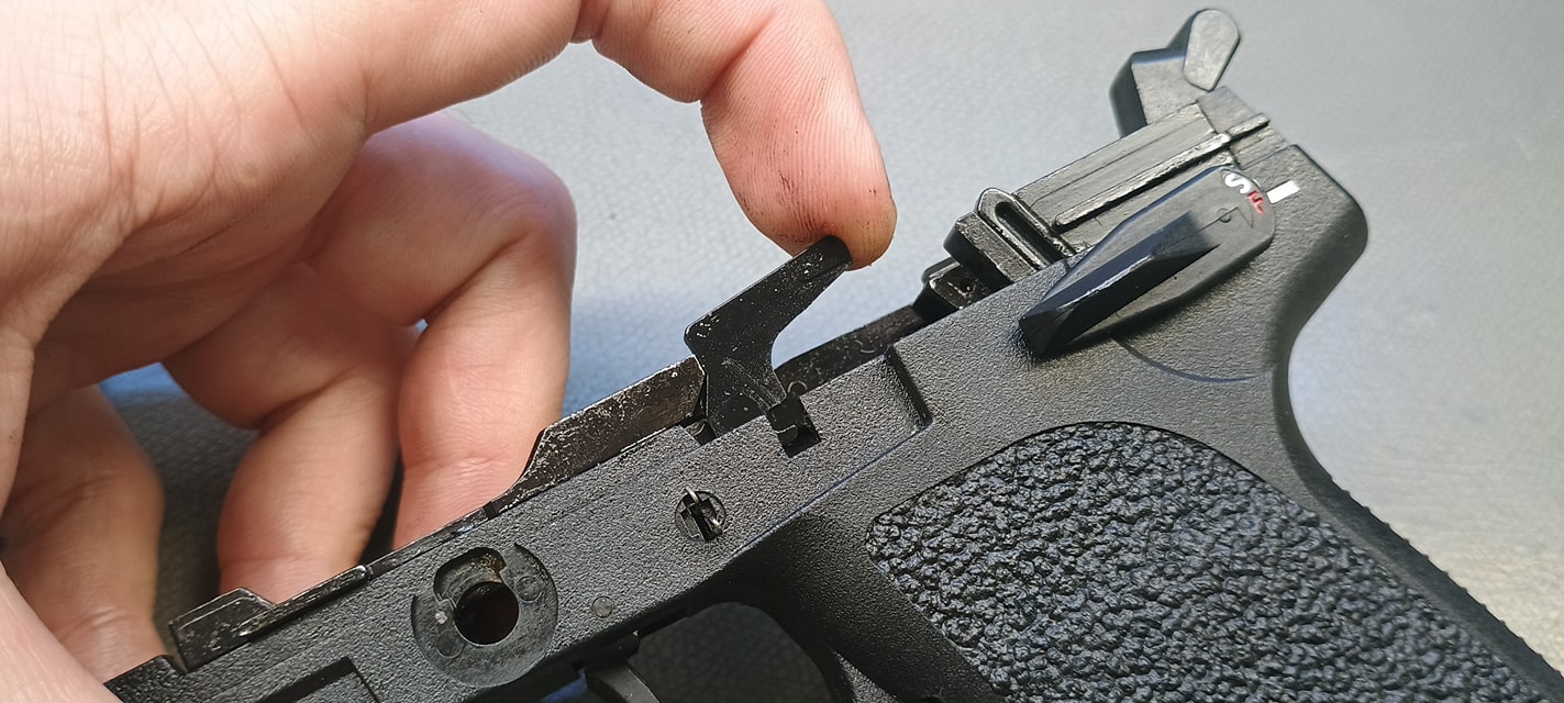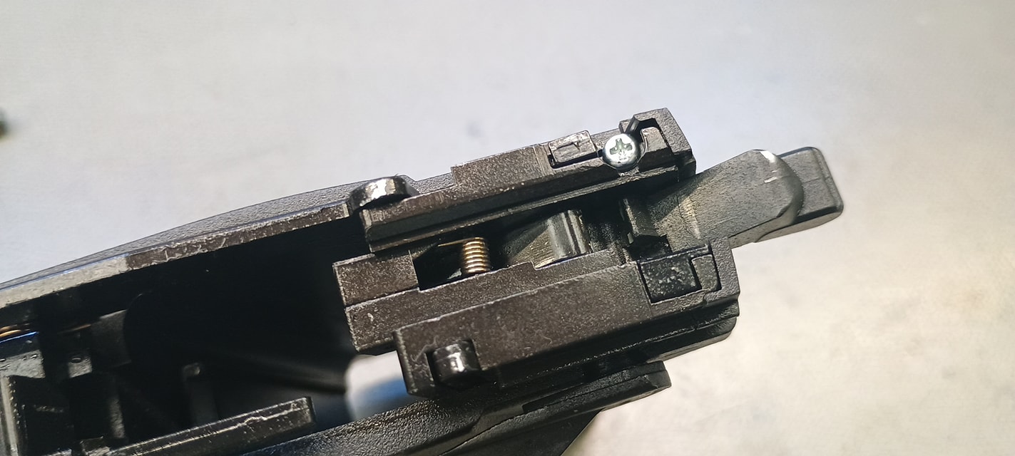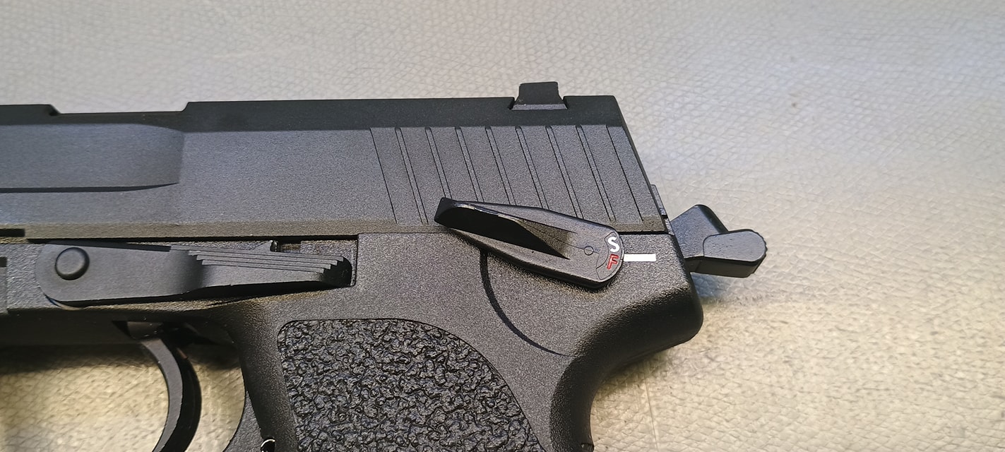 And then there's the trigger. On one hand, it's surrounded by an uncomfortably large trigger guard. I guess this can be attributed to the fact that German men are bigger (at least their hand :D ) so the trigger guard had to be enlarged. Also, the guard may be bigger because of the idea of glove use. The other thing is that the trigger itself is made of very little material, so unfortunately it breaks regularly. This breakage can occur because you can pull the trigger in a strong manner, it doesn't stop at a barrier, so you can keep stretching the material itself - then it suddenly snaps off on the right side. Finding a replacement part is borderline impossible – you either order a TM HK45/USP steel replacement part, or maybe a TM factory part, or you have to contact SRC directly to buy from them. Unfortunately, TWG usually treats it as a non-warranty failure, so the replica has a chance to land in the trashbag after „a little squeeze”. Interestingly, it hasn't broken for me so far, as I carefully „dance” around the firing pin - I don't wait for the reset of the trigger, instead I release it back immediately with a characteristic bouncing motion.