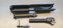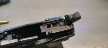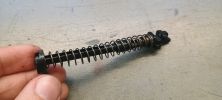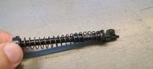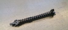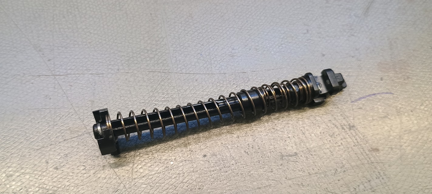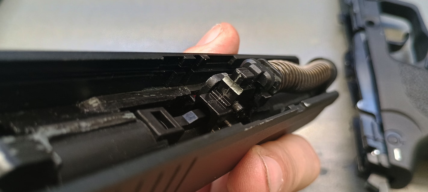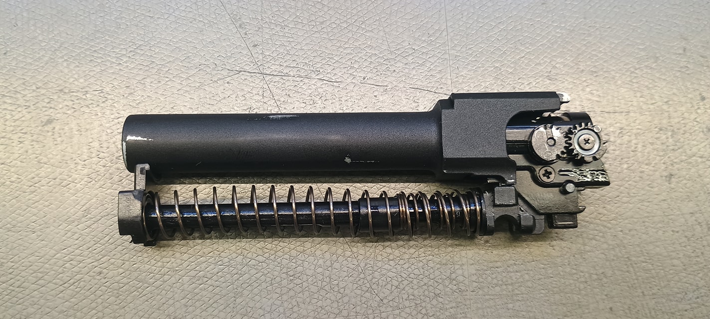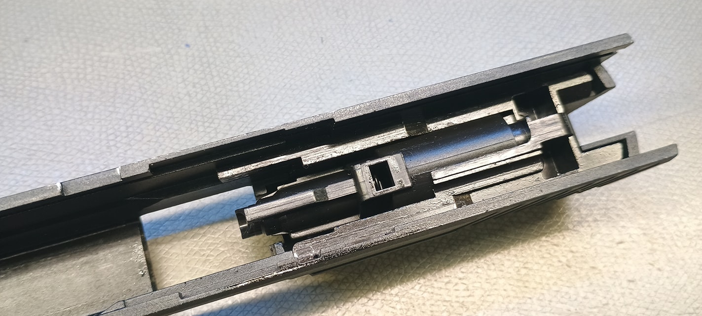 The recoil spring guide also strongly resembles the Marui design, except with a much stronger spring. The spring guide itself is considerably more robust - there are also more plastic spacers and other similar stuff. The spring guide has two stages, of which the second stage is very well sized. When the slide gets to the fully rearward position, that's when the second stage starts to work - absorbing a lot of energy, giving the gun's slide a brutal swing boost. Because of this, the recoil is dampened, but it still packs a huge punch - making the lever do a surprising amount of work. The two-stage spring guide also helps a lot to ensure that the slide catch always engages, as it leaves minimal pause and wait for the force of the second stage in the spring guide.