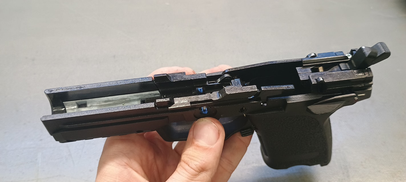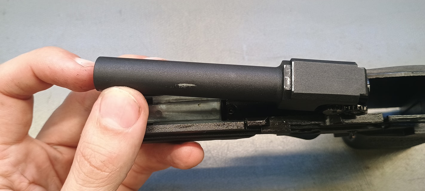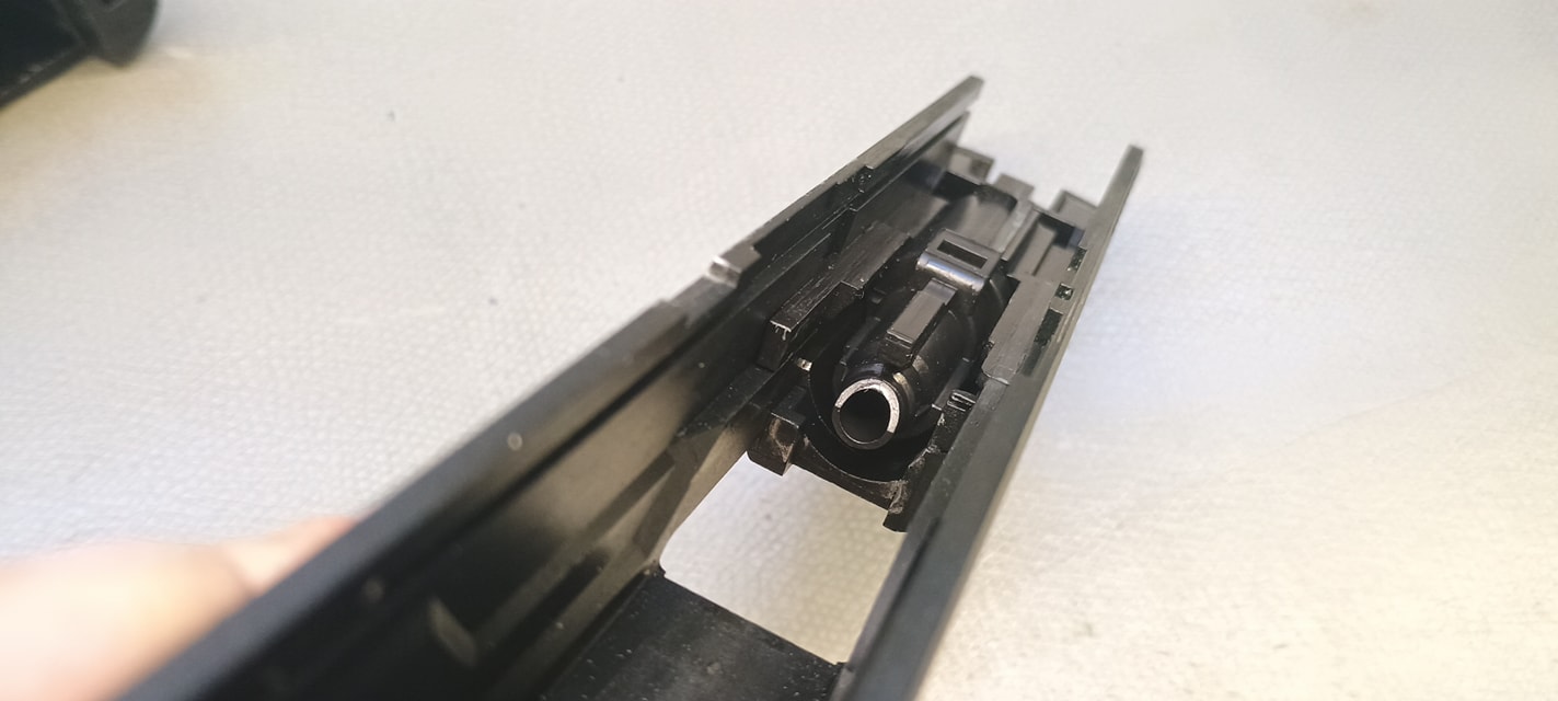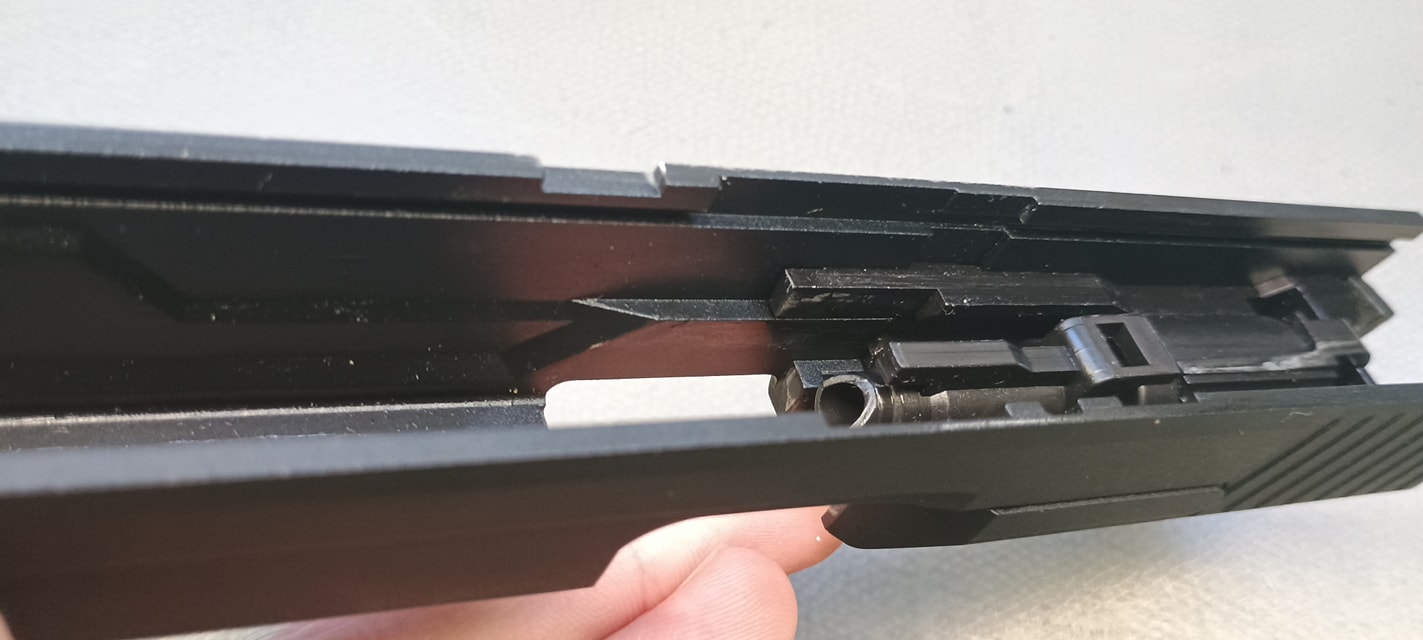 The hopup unit of the pistol is also similar to the Marui, but not identical. It is externally adjustable, so the slide does not need to be disassembled for hop adjustment. For me, it was smoothly adjustable out of the box for 0.25-0.36 BB weights, and I was able to go up to 0.32 with replicas of the same model from other people. The spread, accuracy and range are definitely good, as is the power of the pistol. With a CO2 magazine, you can easily shoot over 1.5J (which is the local Hungarian CQB limit). However, it is also an unfortunate experience, but hop chamber breakage is a common occurrence. It is the end of the chamber that breaks off, more specifically the claw that slides under the frame. This leaves the gun working, although with a slight loss of accuracy – still, even with this loss of accuracy, it remains a viable backup option if you need to use one, everything remains smooth and usable. The hop chamber can swing a little more upwards, but it's really the slide that determines how far it can swing out in the end. What I've noticed is that people who have dropped it or run it with a CO2 magazine in hot weather have almost always had this failure. What is also striking is how much the outer barrel tilts when the slide is in the rear position – with it hanging backwards, the muzzle is pointing all the way to the sky.