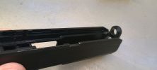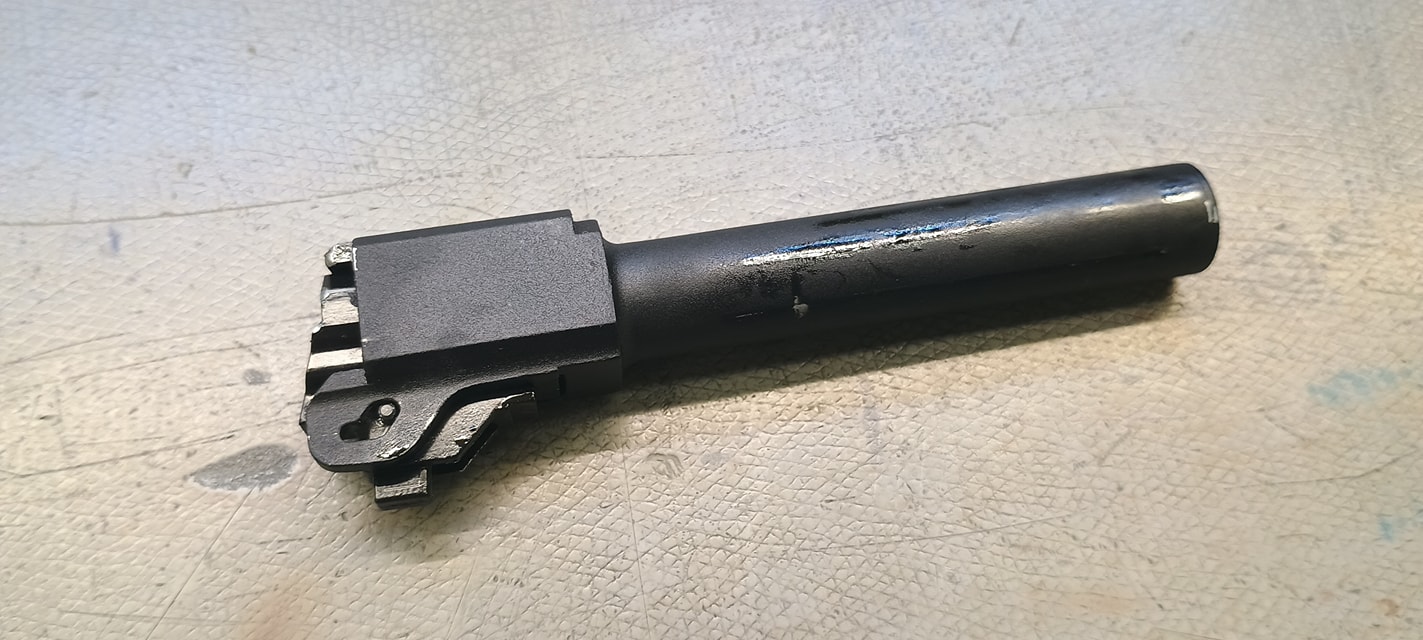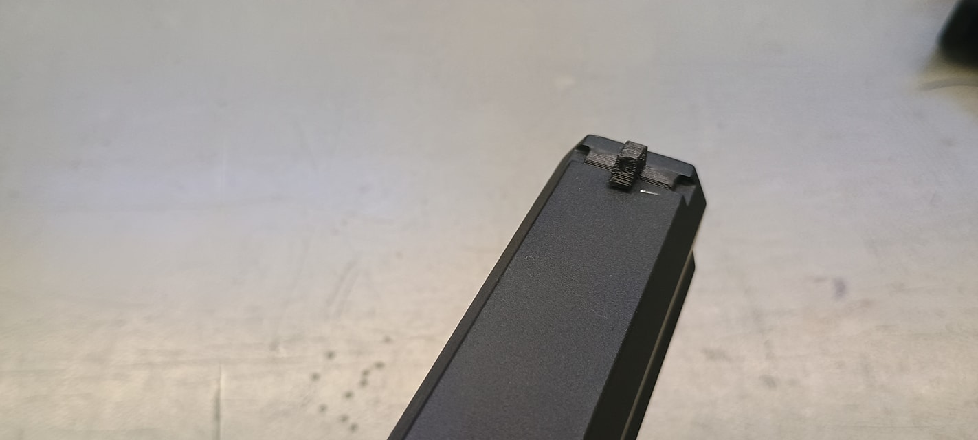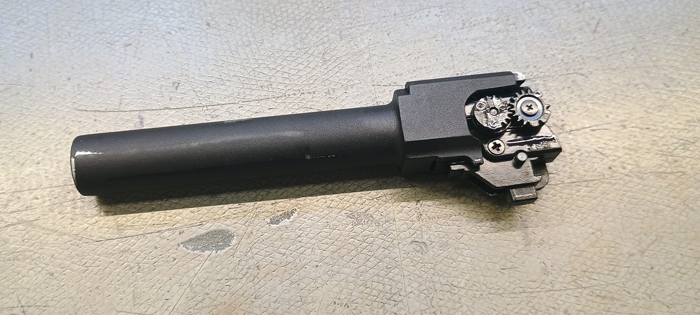 The hopup unit of the pistol is also similar to the Marui, but not identical. It is externally adjustable, so the slide does not need to be disassembled for hop adjustment. For me, it was smoothly adjustable out of the box for 0.25-0.36 BB weights, and I was able to go up to 0.32 with replicas of the same model from other people. The spread, accuracy and range are definitely good, as is the power of the pistol. With a CO2 magazine, you can easily shoot over 1.5J (which is the local Hungarian CQB limit). However, it is also an unfortunate experience, but hop chamber breakage is a common occurrence. It is the end of the chamber that breaks off, more specifically the claw that slides under the frame. This leaves the gun working, although with a slight loss of accuracy – still, even with this loss of accuracy, it remains a viable backup option if you need to use one, everything remains smooth and usable. The hop chamber can swing a little more upwards, but it's really the slide that determines how far it can swing out in the end. What I've noticed is that people who have dropped it or run it with a CO2 magazine in hot weather have almost always had this failure. What is also striking is how much the outer barrel tilts when the slide is in the rear position – with it hanging backwards, the muzzle is pointing all the way to the sky.