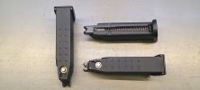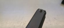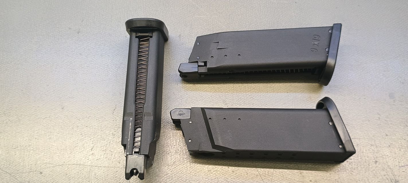 The gas version uses the same paint scheme as the parts on the pistol. The magazine material is aluminium, incredibly light compared to the magazines of other pistols. On the magazine body you can see holes similar to the real steel ones - which would help you count the available ammunition – but here they are just for decoration. The notches for the magazine catch are at the front, they are not very deep notches. In addition, the wear is already visible after a few games - and after completely wearing off, it needs to be sanded again to have a notch. The magazine base is a tiny, thin plastic. It doesn't seem to be strong, but it's more likely to fall off the magazine than break when dropped. The filling valve is located under the magazine pad, nicely accessible through a hole. My biggest problem with the whole magazine is that the o-ring is very undersized. Specifically, an o-ring with an excessively thin diameter was installed here, which can dry out or get damaged easily. When I used the pistol mostly with black gas in the winter, the main seals failed much faster. On a side note, the sealing block is attached with pins, which I absolutely hate, experience has shown that they are much more susceptible to dropping, gasket aging, etc.