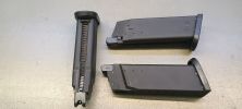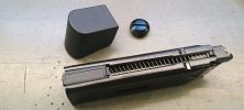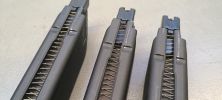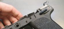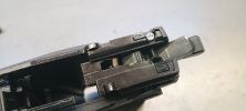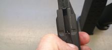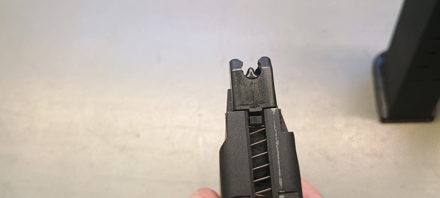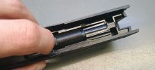 Another common feature is that the loading ramps of both magazines are wide and quite high – meaning, loading BBs into them is very easy. The upper part of the feeding block is pointed, so you can start loading BBs from the left and right equally. The block locks tightly with a follower that can be gripped with a fingernail and the whole block pulled back. It's a bit awkward to grip and pull back the follower, you need to have some fingernail. The part that lifts the slide catch is sturdy, but not very large.