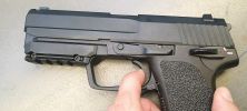 The first nice point is that the pistol came in a sturdy and good plastic case. The second nice point is that they did not copy the attitude that H&K users usually encounter, so the standard mount came pre-installed on the pistol. Another surprise is that the colour of the pistol is very uniform - no different shades of black on the replica. The finish is a nice semi-gloss black color with a metallic feel. There are no markings to be found anywhere, these have been understandably dropped after Umarex's defensive attitude on the European market. The only things that break the uniform colour of the replica, are the white and red marks on the safety lever and the sights. The plastic used for the frame of the pistol is robust and durable, it does not creak or deform. The metal parts, by the way, have machining marks or lines in many places - I'm thinking of the safety lever in particular, which turned out extremely ugly.