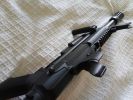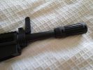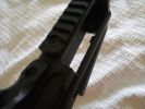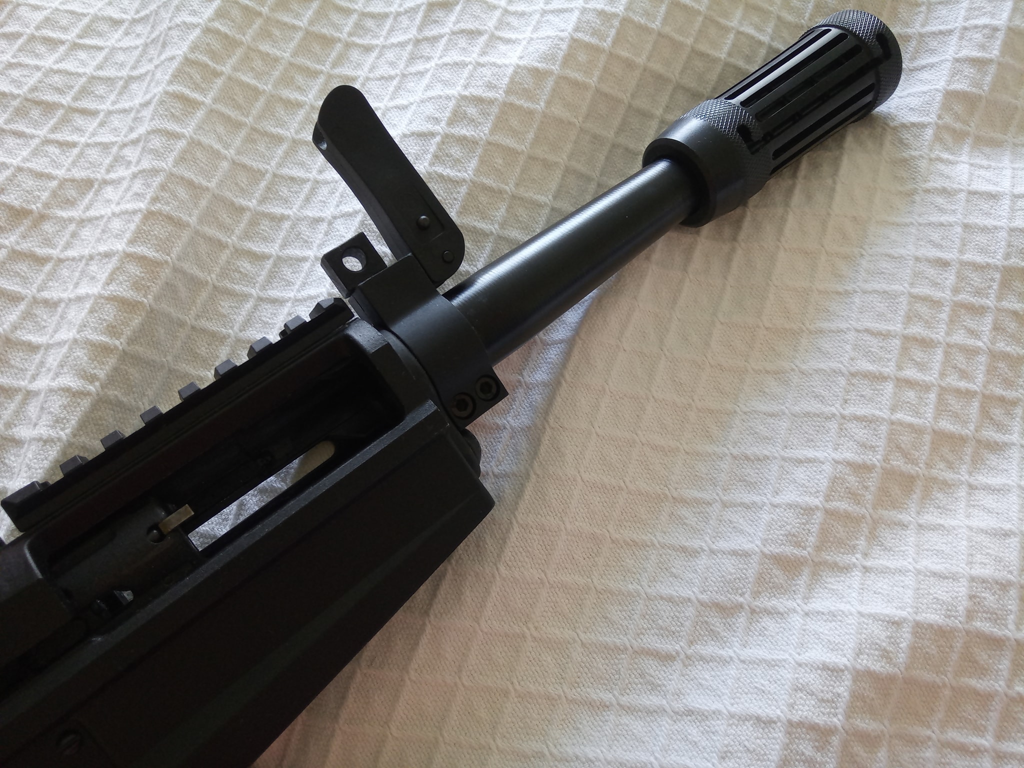 The first surprise is that the gun is all black. Finding any deviation in color is difficult - in this respect, the photos taken with the white background are not very lucky. The weapon is basically made up of two parts, the shotgun itself and the stock. The shotgun itself is fully aluminium, so it's very light. The stock (including the adapter) is a combination of plastic and metal parts. The outer barrel is aluminium, which is machined quite badly – it is full of concentric circles. Unfortunately, the choke at the end of the barrel is plastic. A feature of the choke is that it can be fixed to the end of the outer barrel - on the real steel version, it protects the user from shrapnel and other things that might occur from close range shots fired at the doors/windows. The mounting rail on the receiver, and the barrel adapter used for M4s are screwed on separately. The surface of the receiver is slightly rough, but it has a very nice finish - this is true for the whole gun, it is a nicely finished example. The sights are fold-up and fold-down, they are extremely simple and puritanical - real „back-up” sights, not much of use for regular shooting. The bolt is clearly visible from outside, its surface finish is rough and grainy. The bolt action handle is on the left side and is all steel but unfortunately the pin that holds it in place is loose – you can easily lose it. The magazine is all plastic, it certainly won't withstand a BB hit during play and I don't think it will withstand a drop either. The magazine itself is thin plastic with a moderately strong spring, and has a capacity of 5 shells.