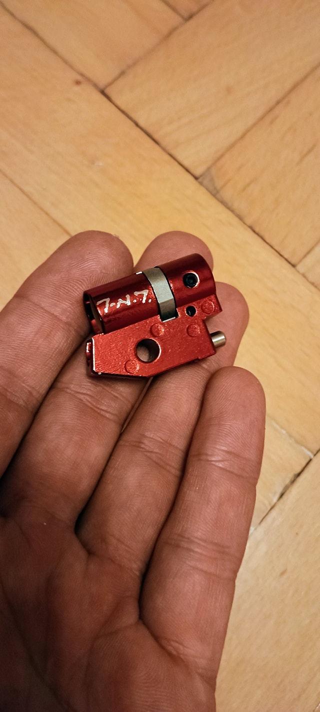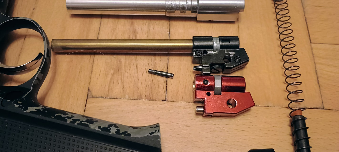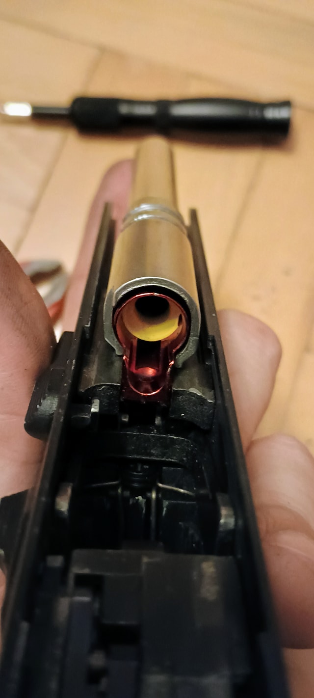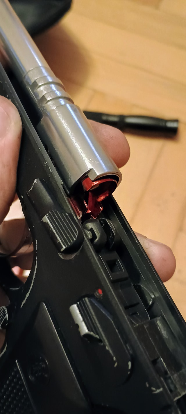 A beépítés során olyan problémába ütköztem, hogy a rugóvezető mérete nem volt azonos a hopup kamra csapjának méretével. Emiatt a rugóvezetőt fel kellett fúrjam, hogy az a hopup kamrára felhúzható legyen. Ez direkt történt így, mivel gyárilag nagyon rövid csapolás van a rugóvezető pozícióban tartására. Elviekben így stabilabb a rendszer, de némileg dolgozni kell vele.
