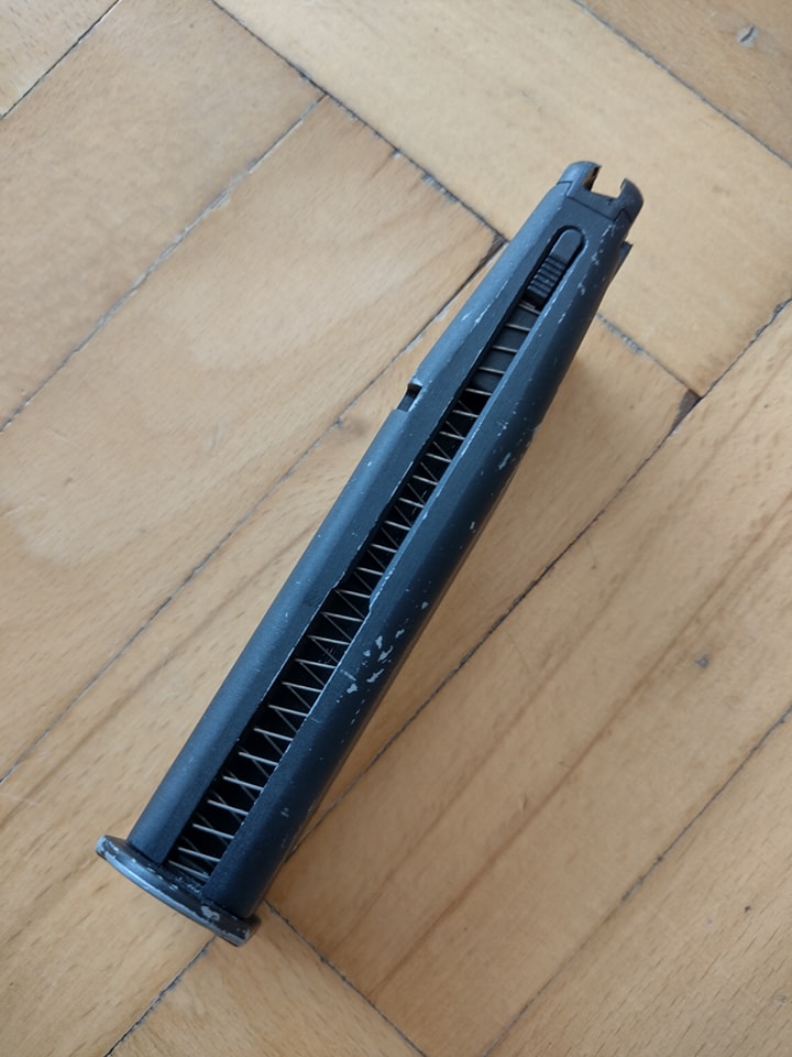Tárja a tokkal azonos színben került festésre, de érdekes módon sokkal tartósabb - szán lehet a cnc marás miatti hűtőfolyadék zsírja miatt lett borzalmas minőségben festve? Viszont az éleken azonnal kopik a festés, szóval nagyon örülni itt sem kell. Adogatópályája a teljes hossz közepén került szélesítésre, maga az adogatótömb is csak picit emelkedik ki a tár síkjából - ergó tárazni nem kifejezetten kényelmes. Tárajkon keresztül betárazni szintén kényelmetlen, mert a tárajak szintén kissé szűkös lett. 25 BB kapacitása teljesen korrekt, amelyhez kellően elégendő a gáztartály mérete. Számomra a szomorú pont a keresztcsapos gáztartály lezárás volt, amit magam részéről kifejezetten utálok. A megoldás védelmben szóljon, hogy kellően sok anyag van a tártest vége és a csapok helyei között, így az anyag deformációja nem fog gondot okozni - mint mondjuk a P226 vagy M9 típusok esetén. Érezni, hogy a KJ levonta a tanulságokat az előd pisztolyain. A gázkiömlő gumi meglepően magas, viszont a nózi és szán jó tervezésének köszönhetően nem szokott sérülni. További érdekesség, hogy ugyan ezt a tárat használj a CZ75 SP01 Shadow verzió is, de az összes további típus már egy másik fajta tárat használ ismét.