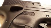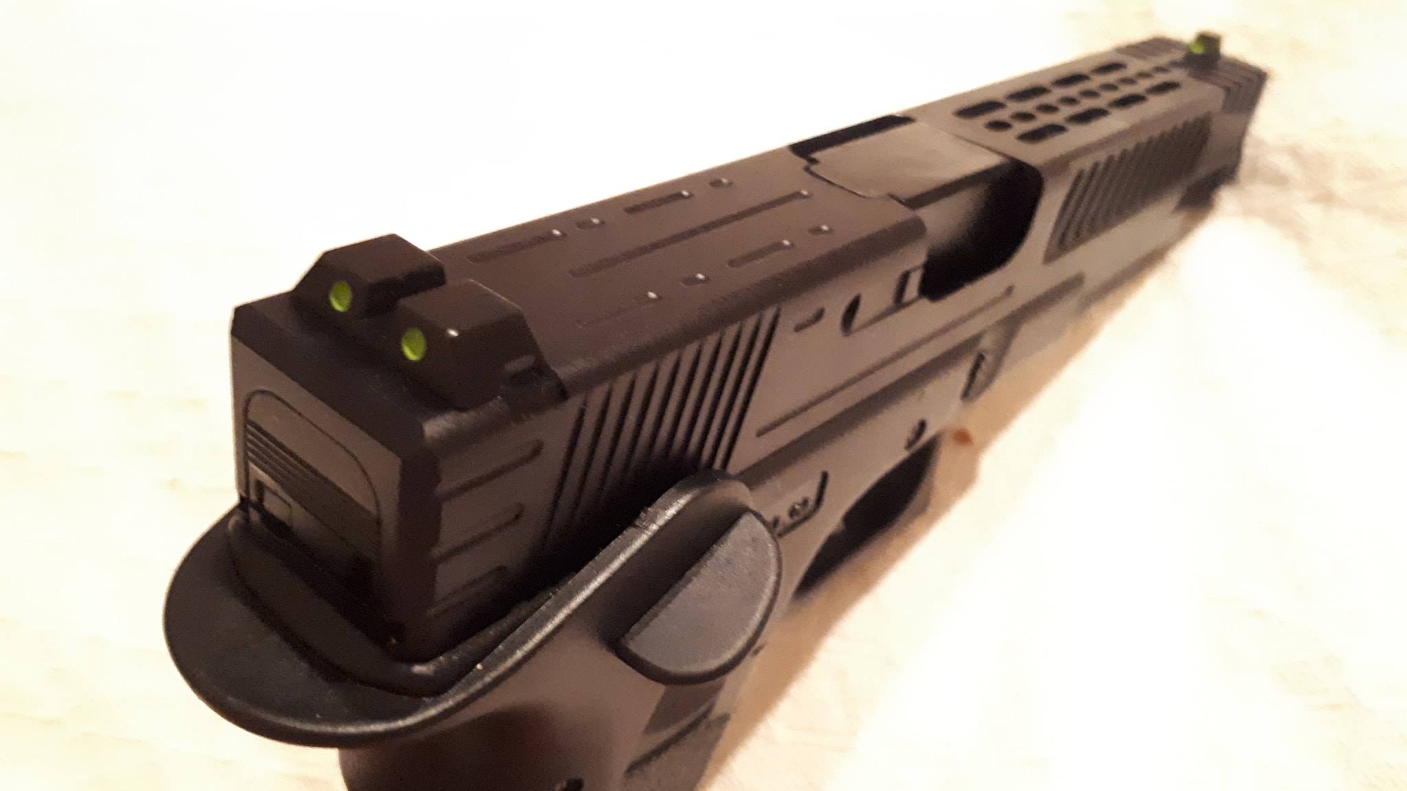 Különböző külsejű verziók közül nekem a D verzió tetszett a legjobban. Teljesen cnc mart aluminíum szánja futurisztikus, tégla/kocka formája szanászét könnyítve. Sokak számára nagyon féltégla megjelenésű, ami nekem kifejezetten be is jött. A megmunkálás egészen szép lett, habár pár helyen felfedezhető - leghangsúlyosabban a hüvelykivető nyílás oldalfala látványos. Minden más felület tükörsima, szép feketére eloxálva. Azt viszont erősen meg kell jegyezni, hogy minden megmunkált él durva, éles, szószerint vágja a kezet. A külső cső jó hosszú, ahogy az egész szán méretes. Tetszetős, hogy a külső cső is teljesen CNC-munkált, torkolatban szépen eldolgozták a végét - eléggé látványos azt meg kell hagyni. A külső cső és szán találkozása pontos, jól illesztett és jellegzetes fémes csattogó hangot ad, imádom használat közben a hangját. Ezen túl a pisztoly tokja is szép lett. Eleve ez az első kiadás, ami a hátsó szánvezető/elsütőház csavarjánál rézperselyes és nem műanyag csavart használnak a tokba betekerve. Sokkal stabilabb és tartósabb a sima Marui-féle megoldáshoz képest - más gyártók is tehetnének így. A tok egészen fényes műanyagból készült, markolat textúrája nem kifejezetten erős, durva, jól érezhető. A feliratok gyönyörűen vannak fröccsöntve, sokat dobnak a látványon. Fura, hogy a tok nem teljesen párhuzamos - az orra lefelé lejt, nem egyenes. Ez nekem később a szánvezetők cseréje során derült ki és okozott plusz munkát. A tokra illesztett hattyúnyák is jól illeszkedik, kényelmes és ténylegesen hozzátesz a pisztolyhoz. Ahogy a tártölcsér is jól működik, habár kissé mozog. Normál méretű szánakasztó van a pisztolyon, miközben a G34 egyik sajátja az enyhén növelt kialakítású megoldás. Elsütőbillentyűben megtalálható a típusra jellegzetes biztosítás, amely határozottan és jól működik szerencsére. A Marui ötlete alapján betervezett rejtett biztosító is megtalálható, amely a tok aljában található szériaszám elcsúsztatásával működik. Tárkioldó műanyag, rugója kellően erős és a kioldó kikopásáig biztosan jól működik majd. Irányzékok zöldre színezett, kellően hangsúlyos célgömbökkel szereltek - semmi extra, teszik a dolgukat.