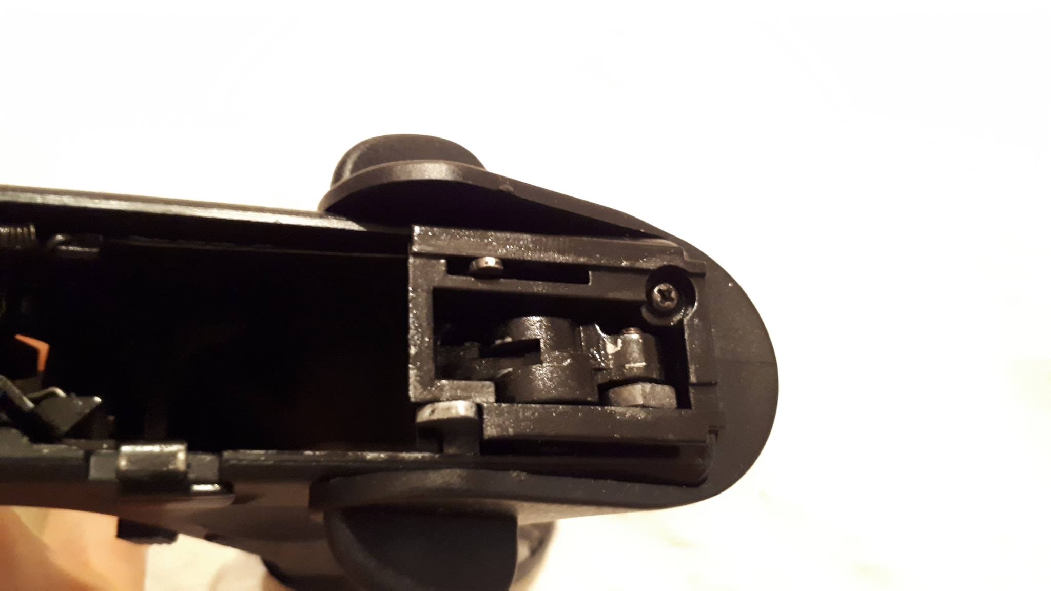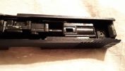 Bentebb haladva a szánban még nincs változás, egyezik minden az R17-tel. Gumitalpas, átalogs erősségű rugóval szerelt helyretolónk van. Teljesen átlagos, fejlesztésre szoruló hopup egységünk - gagyi rézcső, Marui-like puha és vacak hop gumi, standard állítótárcsa, alapból ferde és gyengeanyagú lenyomólemez. A nózi továbbra is az Armytól megszokott kidolgozású, enyhén rugalmas műanyag. Meglepően jól működnek, de manapság ezek belső szelepe erősen sorjás és hajlamos megszorulni - emiatt lefújja az összes gázt a csőtorkolaton keresztül. BBU gyorsan elhasználódik, főleg a kakas által megütött kontaktterület mentén. Ráadásul a CNC-mart szánt picit elméretezték, a BBU és szán között lényeges rés található, emiatt ide az elsütőrudazat szeret beakadni és az egész szánt emiatt elakadhat. Nekem az elsütőrudazatot cserélni is kellett egy szélesebb, vastagabb kialakítású példányar - emlékre GunsModify került be. Amit hiányolok, az a szán ütközés csillapítása. A gumi betét nem elegendő, amire a WE szépen kijavított. WE Glock-ok esetén egy műanyag betét kerül beépítésre, ami jól működik - ellenben az APS gumirugós megoldása folyamatos gumirugó cserére késztet annak túlterhelése miatt. Nos, az Army esetén egy gumilap kerül beépítésre a szán elejébe, ami használat során egyértelműen elégtelennek láttam. A szánvezetőt sajnos a szán deformálja, ahogy üti az elejét. Ezt a deformáció folyamatos ellenőrzést követel - mivel a deformáció érinthető a szán belső szánvezetőjét és akadhat a szán emiatt -, korrekció és reszelés kellhet. Emiatt én az egész szánvezetőt cseréltem acélra, amelyből a Guarder nagyon nem volt jó választás. Méretproblémába ütköztem, amelyet nem kevés csiszpapír és idő felhasználásával tudtam javítani.
