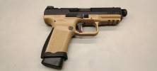 A Canik TP9 formavilága nagyon jól sikerült. Hozza a sportpisztolyos vonalat, miközben számos versenytársától lopott vagy szedett el jó ötleteket. Ilyenek, mint a szán vége (Walther jellegzetesség), méretes és lekerekített sátorvas (inkább H&K formavilága), elsütőbillentyű biztosítás (ami megoldására egy sportos Glockot idéz), szétszedőkarja (szintén Walther-szerű), hatalmas és kétkezes szánakasztója (Walther jellemző ez is), a szán formája (nekem H&K VP9-et jutatta eszembe először), menetes cső (szögletes menetvédőről nekem az FN ugrott be valamiért) és sorolhatnám. Nekem olyan érzésem volt, mikor egy buli után a hölgyet minden más pisztoly kipróbált volna, így létrejött egy kényelmes, ergonómikus és hatékony ivadék és mindenki döntse el ki az apja.