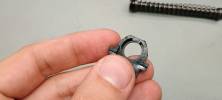 A külső cső kissé hosszabb a pisztoly szánjától. Nekem érzésre kicsit rövidebb hosszt is elviselt volna. A rajta lévő menetvédő bomszli, hatalmas és szögletes elem. Anyaga alumínium, festés erősen fényes és mélyfekete - mindentől elütő színű. A menetvédő meglepően súlyos példány, rögzítésére nem applikáltak o-gyűrűt, egyszerűen erőből kell feltekerni a megfelelő rögzítettség érdekében.