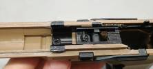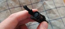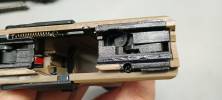A hop esetén sajnás a WE még mindig nem hajlandó elengedni a borzalmas, kisablakos belső csövet. Ellenben a lenyomó lemez kellően nagy, erős jól beállítható. Azt sajnáltam, hogy eléggé kicsi a hop hatás beállítási tartománya - de ezt remélhetőleg később tudom javítani egy állítótárcsa cserével. Alkottam egy gumilapból egy betétet a lemez és a gumi közé, így a lemez gumit vágó tevékenységét is sikerült megoldani, miközben rögtön megkaptam az elvárt .30-.32 BB számára szükséges hop hatást. Kicsit furcsa, hogy nagyon aprócska műanyag darab van a szán elejében - amellyel a fém-fém ütést próbálják csillapítani. A rugóvezető fém, hop kamrához csapolással illeszkedő és kellően erős helyretolórugót kapott. Külső cső a Glockokra elmékeztető megoldást kapta - jobb oldalt két szárnnyal a tokban billenő, reteszelő mozgást végez - fix, nem mozgó külső csőnek jobban örültem volna. Maga a szán enyhén lötyögősen illesztett. Nem zavaró a lötyögés, de a WE-re jellemzően inkább keresztbe lötyög.
