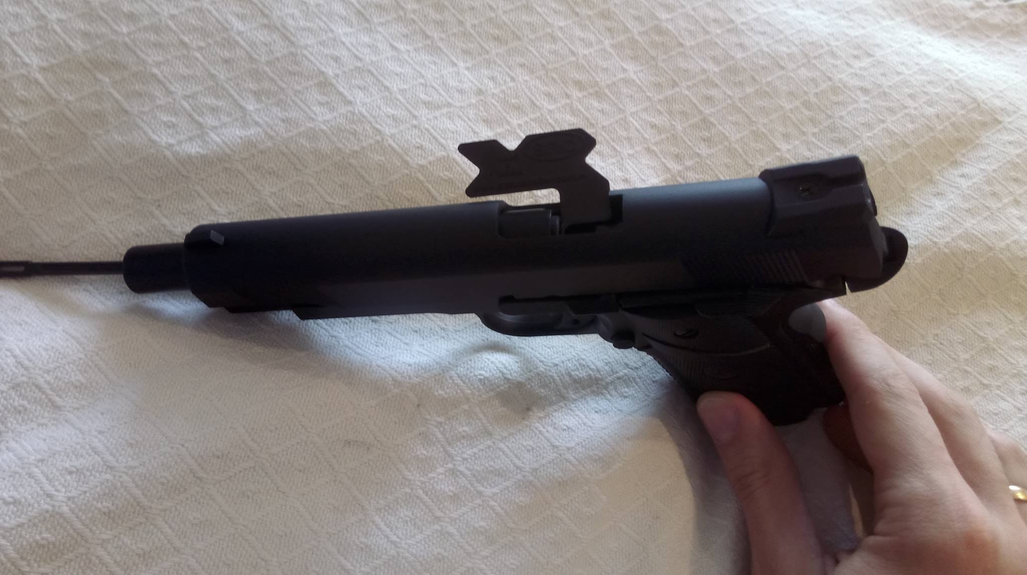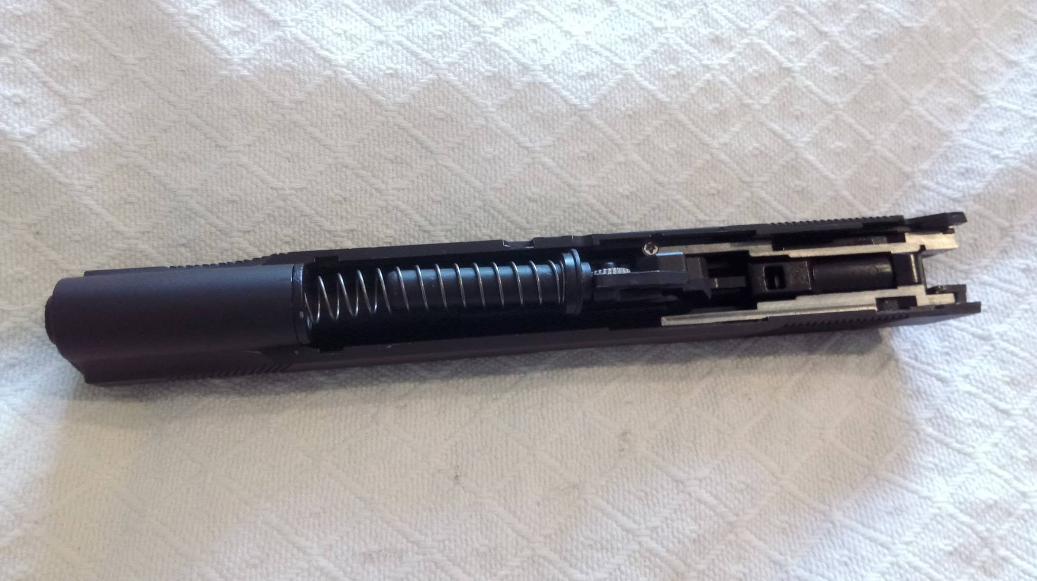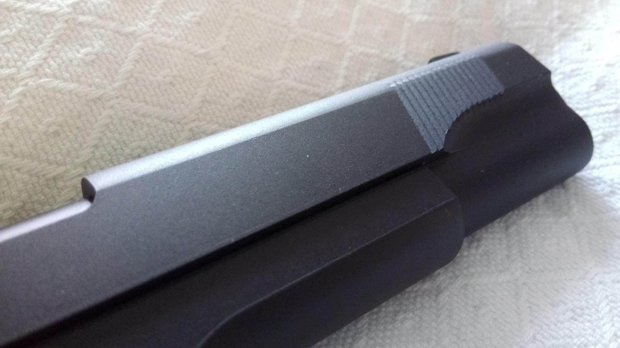 A szán lötyög a tokon állandó jelleggel, felszerelésük egyik állandó zajforrása lesz. Szétszedése a 1911-ekhez megszokott, amely után a szánt szemügyre véve sok meglepetés vár. Az első, hogy a dugattyúház síkköszörült, érdekes módon akadás kevésbé jellemző rá, mint a többi 1911-re. A következő meglepetés, hogy a külső cső és annak reteszelő-szemölcsei nagyon eltérőek. Egy rámpa található a külső csövön, ami annak beakadását teljes mértékben megakadályozza, nagyon jó megoldás. Következő meglepetés maga a hopup, mivel az állítókerék az egyébként drága és zseniális Maple Leaf megoldását koppintja, ráadásul fémből van. A lenyomó lemezke vaskos és erős, nem hajlik el még idővel sem. A belső csőből láttam már jobbat is, ahogy a hopup gumi sem nagy szám. Érdemes a belső cső ablakát jelentősen kiszélesíteni, így jobb gumival képes lesz nehezebb BB-ket is kezelni. A hopup fejlesztése után korrekt lőtáv az eredmény.