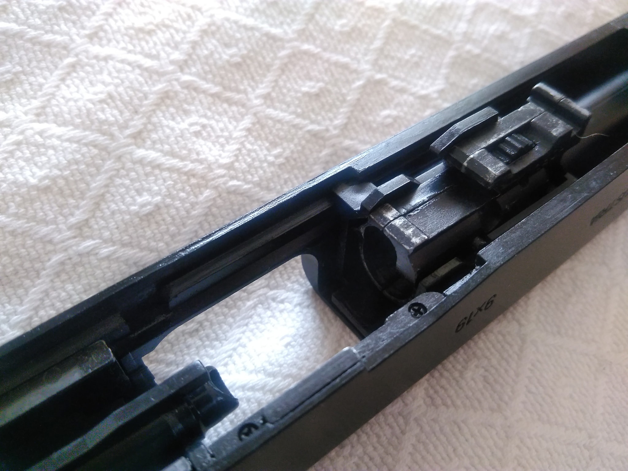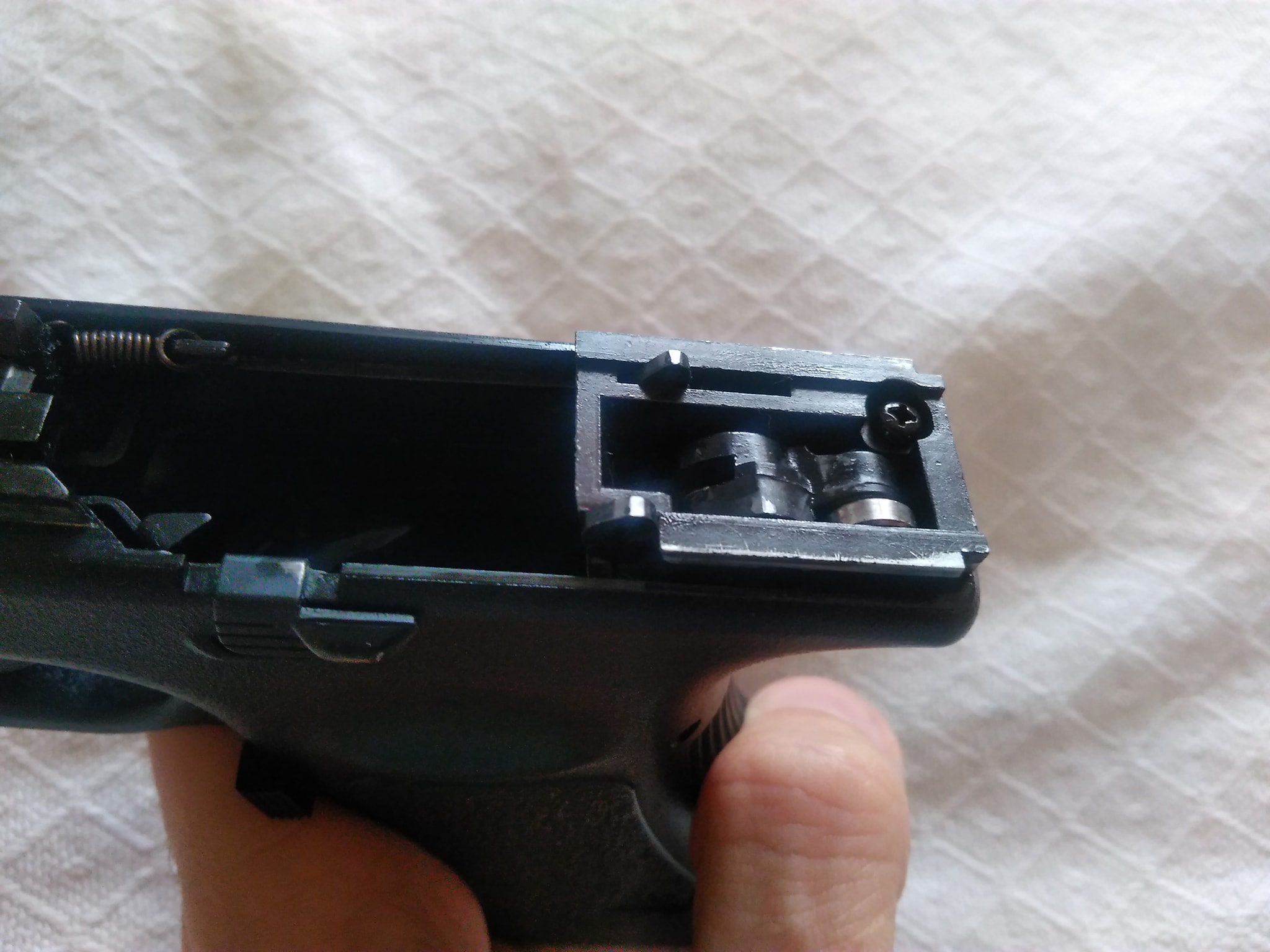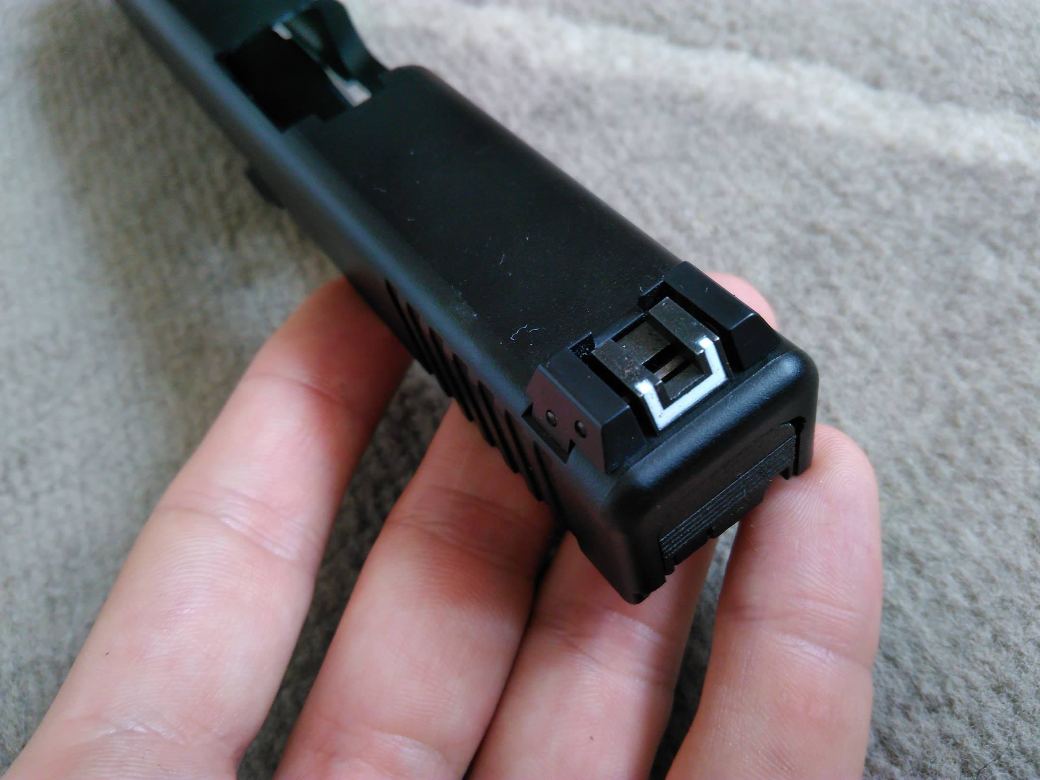 Továbbra is műanyag szán kerül a pisztolyra, de a szánakasztó mentén fém betét került be, míg a külső cső egy szárny segítségével csúszik a vezetőlécek mentén. A külső cső így elviseli, ha súlyt teszünk a végére (tracer, hangtompító egység miatti elakadás biztosan ismerős egyesek számára), illetve a pontosság is jelentősen javult. Nagyszerűen működik és sport jellegű használat esetén kifejezetten jól jön a teljesen állítható hátsó irányzék - bár külön is lehetne kapni ilyesmit korrekt áron. A szánon belül minden más teljesen azonos mint más Glock replikában, így az elsütő miatti szán akadás is még mindig ott van a listán - amit egy 8mm csapágy azonnal megold.