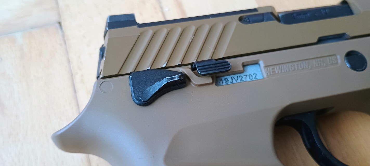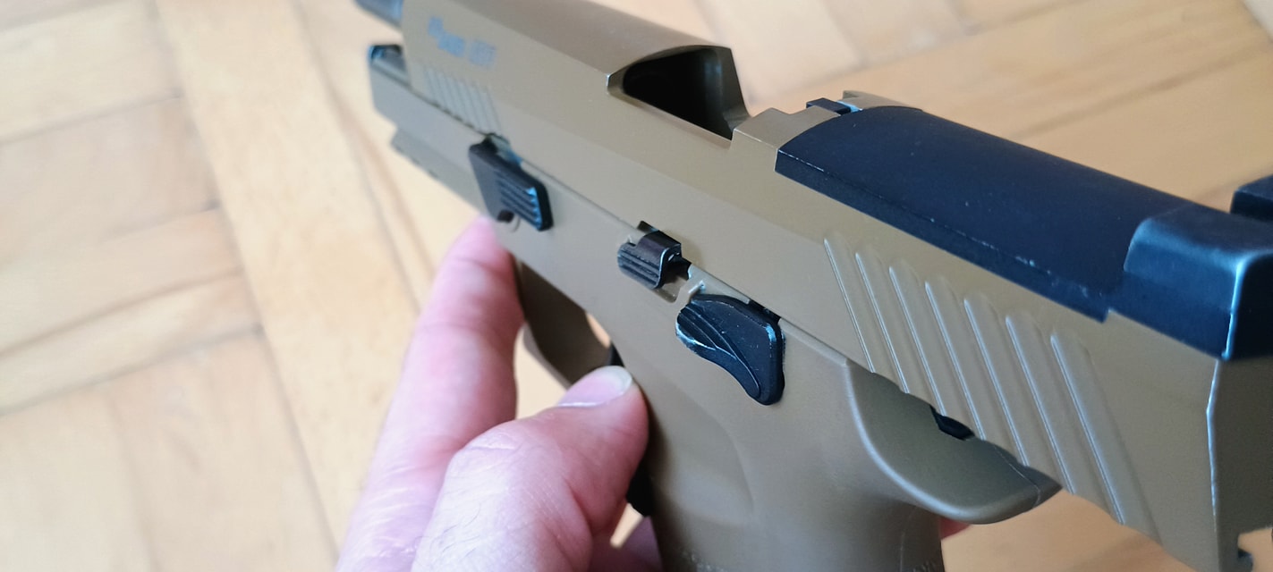 A SIG-re jellemző ahogyan a szánakasztó kinéz vagy éppen elrendezésre került. Egyrészt itt szokatlanul picike a szánakasztó, másrészt nagyon hátulra került. Igazából az érzésem az, hogy van a pisztolyon szánakasztó, de annyira hangsúlytalan helyre került, olyan mintha a gyártó el akarta volna rejteni. Nekem azt az üzenetet hordozza, hogy a szánt hátrahúzva töltsd mindig csőre, ne használd a szánakasztót. Maga a szánakasztó egyébként teljesen kétkezes, de meglepő módon a szánra csak a bal oldali fog rá és a jobb oldali nem. Mint kiderült, a jobb oldali része sérült, illetve itt a szán bevágása is úgy lett kialakítva hogy ne fogjon rá a szánakasztó a szánra. Ennek okát és értelmét nem igazán látom, de így gondolta ki a VFC.
