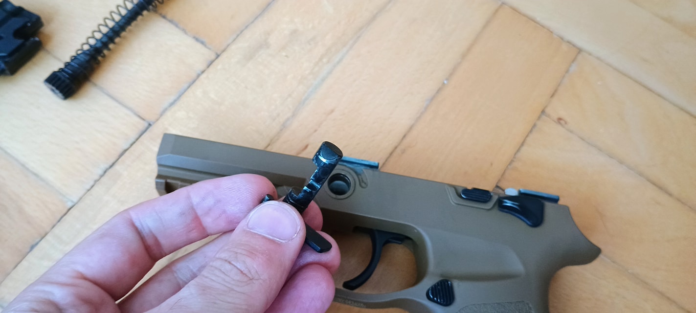 A P320 is a "guided hop" egységet kapta. Ezt annyit takar a gyártónál, hogy a hop egység kívülről állítható, vamilyen módon. Ez pisztolyok eseténben rugóvezetőn keresztül történik. Ehhez adnak is egy szerszámot, amire igazából nem nagyon van szükség. A tárat kivéve, szánt hátrahúzva lehetséges a rugóvezető tengelyét tekerni, így a rugóvezető végén található fogaskerék elforgatja a hop egység mechanikáját.