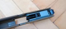 Két vezetőlécet kapunk, egy párat elől és egy párat hátul. Az első vezetőlécek jóval hosszabbak, a teljes szán vezetőlécének arányaiban nagyjából 1/3 teljes hosszúságot kapunk. Én ezeket a vezetőléceket le szoktam csiszolni, szinte polír minőségre több lépcsőben - 600-800-1000-1200-2000 sorrendben. Majd ezen vezetőlécek alatt az egész keretet, ugyanis a szán ezekkel is kis mértékben kontaktban van, az pedig kb homokszórt felületű - érdes, durva és akadozó felület. Itt gond, hogy szériaszámot lézerrel gravírozták be, nem valami mély és hangsúlyos - simán lecsiszolható. Ebben foglal helyet egy kakasos elsütő szerkezet, az elsütőbillentyű, szánakasztó és egyebek. Nagyon kompakt és egyébként elsőre jól átgondolt szett ez. Aztán a használat során jönnek a gondok.