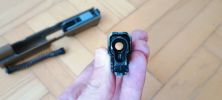 A rugóvezető egy eléggé gagyi spiáter alkatrész, ennek végén a rugót helyén tartó elemet acélból készítették - lemeztárgy kb. A hop egységhez egy csapon keresztül illeszkedik, gyakorlatilag a kamrá kell ráhúzni azt. Maga a rugóvezető nem tűnik tartósnak, látványos az is ahogyan a festést ledobja magáról a rugó miatt. Miután a festés a tokban szép mennyiségű extra koszt csinál, a rugóvezető elkezd láthatóan kopni is. Én úgy voltam vele, hogy egy 5KU acél rugóvezető nem egy összeg, ergó nem vártam meg a törést vagy egyéb hibát. A rugó nekem éppen élhető erősségű, enyhén gyengének érzem - de teljesen viselhető. A WE P320-asán ezt nagyon alulméretezték, míg a VFC esetén valószínűleg a CO2 tár miatt döntöttek ezen köztes rugó használata mellett. Egy TM pisztolyhot mérten 110-115% erősségűnek tűnik, de a szán súlya miatt picit lomhának érzem.