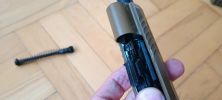 A harmadik, hogy a külső cső feltámaszkodik a szánon. Ezáltal a pisztoly nagyon csattogó, fémes hangot ad ki, illetve a kontakt miatt a szán és a külső cső is szépen elkezdik megenni egymást. Mivel a szán a súlyosabb, vaskosabb és nehezebb, megnyeri a versenyt. Már pár használat után látható a külső cső élének sérülése. Ezt tovább nehezíti, hogy az egész cső mozog minden irányba, így a kopást és sérülést tovább gyorsítja a folyamat. Nekem 130%-os helyretolórugóval a külső csövem 15 tár után olyannyira eldeformált, hogy már reszeléssel javítani kellett - mert akadt. Bizonyos vagyok abban, hogy idővel el is fog törni - ami VFC pisztolyok esetén nem ritka jelenség.