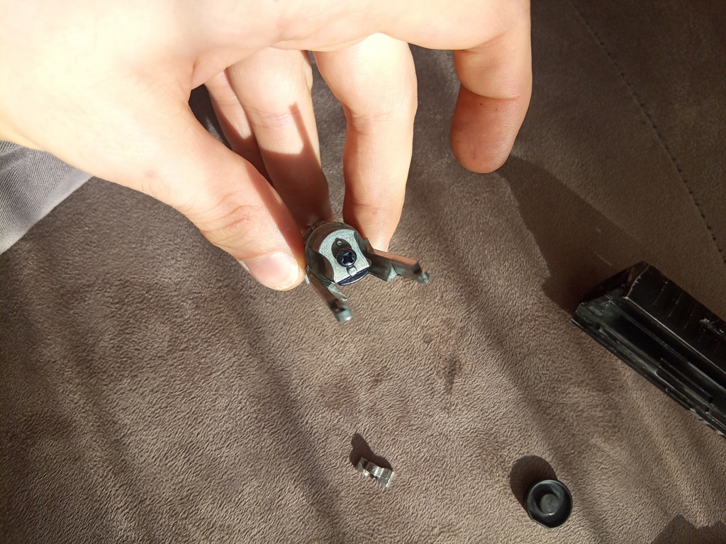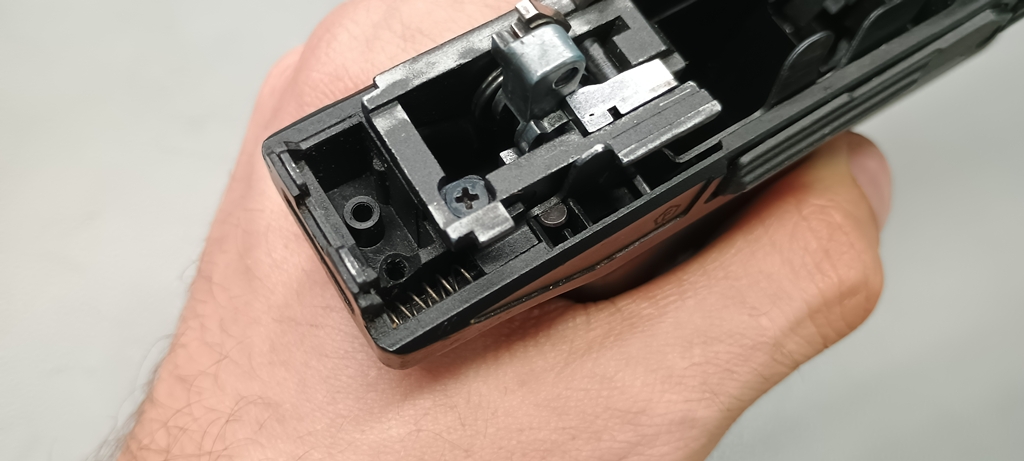 Kapunk egy műanyag rugóvezetőt, kissé gyenge rugóval és fura/idegesítő hopup kamra illesztéssel. A rugóvezető vége nyitott, üreges és egy kockaszerű bemarás található meg rajta. A hop kamrán szintén megvan ennek az ellendarabja, itt kell a két alkatrészt egymásba illeszteni. Ami jó, hogy összeszerelés során ez az illesztés várhatóan szét fog ugrani, így már részlegesen vagy teljesen összeszerelt pisztolynál kell vele vesződni - rossz esetben szorulni és feszülni fog.