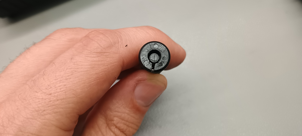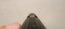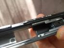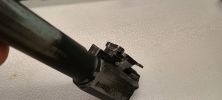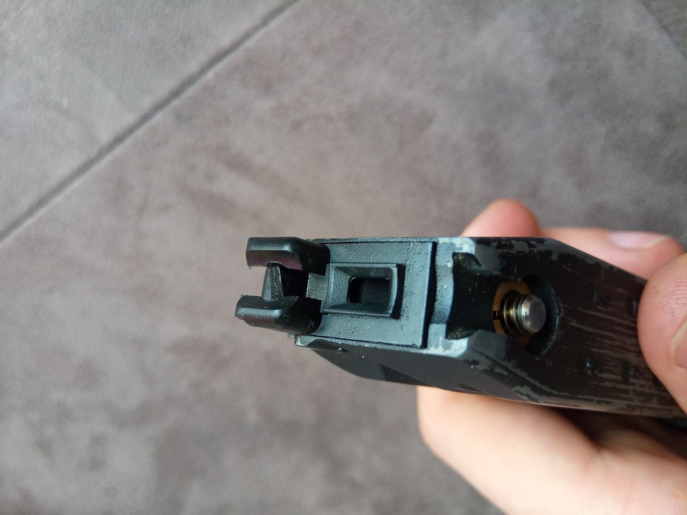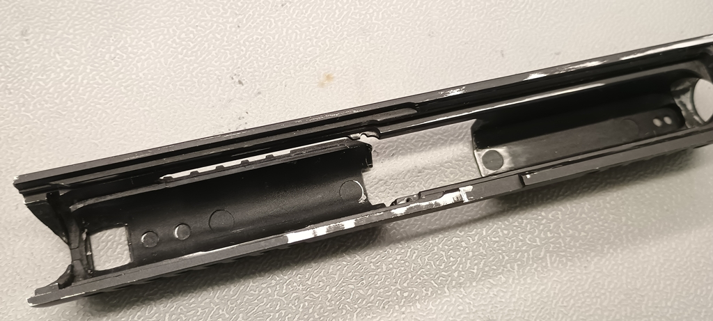 Az első irányzékot egy műanyag betéttel rögzítették, amely a külső csövön ütközik fel. Ez egy ötletes és jó megoldás, hiszen a WE Glock-ok esetén is bevált a műanyag betét használata. De hiába próbálták megakadályozni a külső cső törését és stabilizálni a szán mozgását. Sajnos a külső cső eléggé vékonyka, de ettől sokkal rosszabbul járt a szán. Van egy vékonyka él a szánban, ahol szószerint tizedmilliméteres felvastagság található, éles és határozott éllel, semmi lekerekítés nem található itt. Nos, nem meglepő módon itt a szán rendszeresen reped és törik, ahogy nekem az EU-verziós szánon már el is indult a repedés. Ez sajnos egy olyan tervezési hiba, amellyel nem lehet mit kezdeni. Könnyelmű hiba a gyártó által, ezzel a használhatósági faktort nullára redukálták.