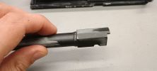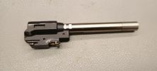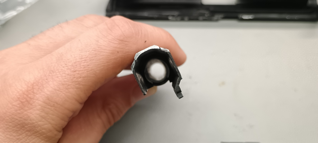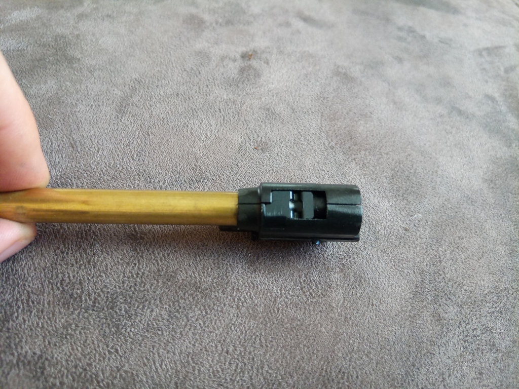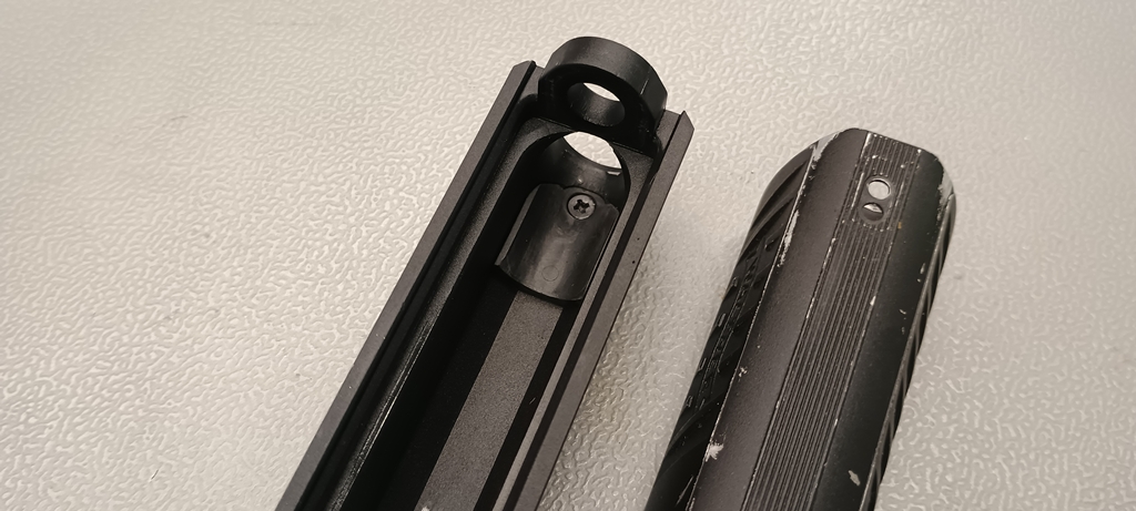 A következő, ha már a külső csőnél tartunk, hogy nem kaptunk menetes véget, csupán a huzagolást imitáló kialakítás figyelhető meg a külső cső végén. Várhatóan tracer és hangtompító használata amúgyis felejtős lenne a szán törés magas esélye miatt. A reteszelés mentén a külső cső és a hop kamra is elkezdett deformálni, szintén nem valami bíztató jel.
