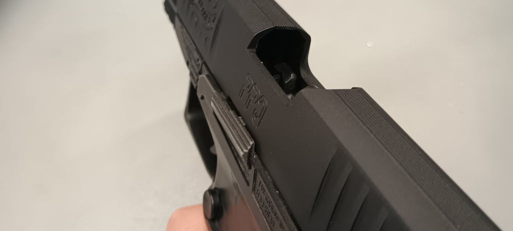 Az első kézbenvétel során megállapítottam, hogy a pisztoly nagyon kis masszív és egyben van érzést adja. Igazán jó arányokkal rendelkezik, hiszen kellően kompakt, forma világa pedig nagyon modern. Maga a pisztoly borzasztóan kompakt és hihetetlen módon kényelmes. Még akkor milyen kényelmes lenne, hogyha a kiegészítő markolatpanelek is meglennének, így 100% kézhez lehetne igazítani. Látványos, hogy német pisztolyról van szó - forma világ egyértelműen német jegyeket kapott -, illetve látványos a kötődés az elődmodellnek tekinthető P99-hez is.