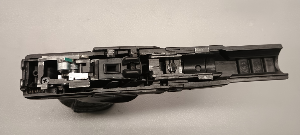 Az elsütő esetén picit sem lepődtem meg, mivel alapvetően egy G18c elsütőt találtam - újrahasznosítás erősen jellemző a gyártókra. Ez az elsütő igazából stabil és működő, a VFC pár ponton belenyúlt. Sokkal erősebb rugók vannak benne, illetve az alkatrészek egymáshoz képesti kapcsolata is hangsúlyosabb. Így kapunk egy átlag Glock-hoz képest sokkal keményebb, hangsúlyosabb és egyébként kényelmesebb sütést. Szerencsére a sütés keménysége nem olyan mértékű, hogy oldalra húzd a pisztolyt miatta. Érdekes módon a reset hangos, ráadásul a reset megtörténte is enyhén érezhető kattanással és jól halható módon történik. További megjegyzésem, hogy a kakason lévő billencs mindenképpen a BBU útjában marad, kis mértékben akadályozza a szán mozgását. Viszont a kakas felhúzásakor jelentősen kilóg, így nagy mértékű kopásra van szükség a hibás működéshez.