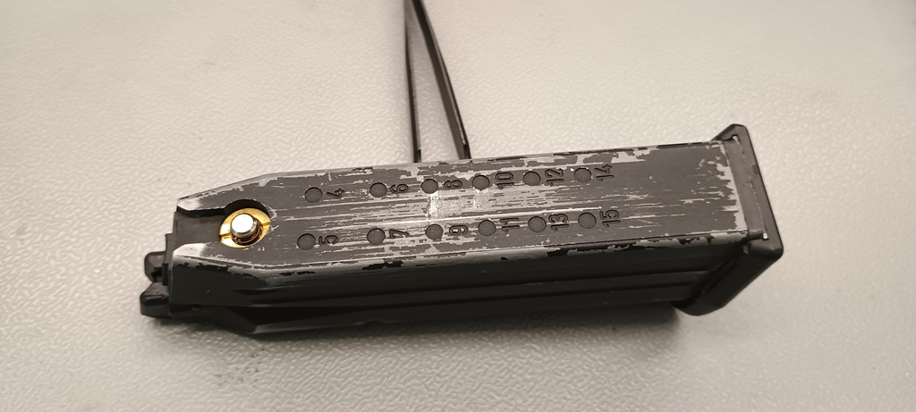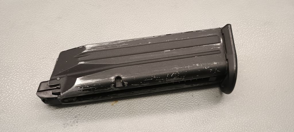 A tár meglehetősen kicsit, G19 méret körüli és 22 BB-t képes befogadni. Ez a tár is tele van különböző feliratokkal és jelölésekkel, amely látványossá teszi. Nem úgy, mint a festése amely botrányosan hamar kezd lepattogni. A viszonylag keveset használt tár is több évesnek tűnik a festés minősége miatt. Ez nincs másképpen a műanyag alkatrészekkel, amelyek nagyon gyűjtik a karcokat és a sérüléseket - ahogy említettem a tok esetén is. Egyébként a tártalp viszonylag aprócska, ívelt formájú. A tár könnyedén tölthető BB-vel, mivel az adogatócsatorna szinte teljes hosszában ki van szélesítve. A tömítést pedig a VFC-re jellemzően nem o-gyűrűvel, hanem formára fröccsöntött gumitömítéssel oldották meg. Meglepő módon, főleg még a Stark-korszakhoz illeszkedően a betöltőszelep a tár alján található.