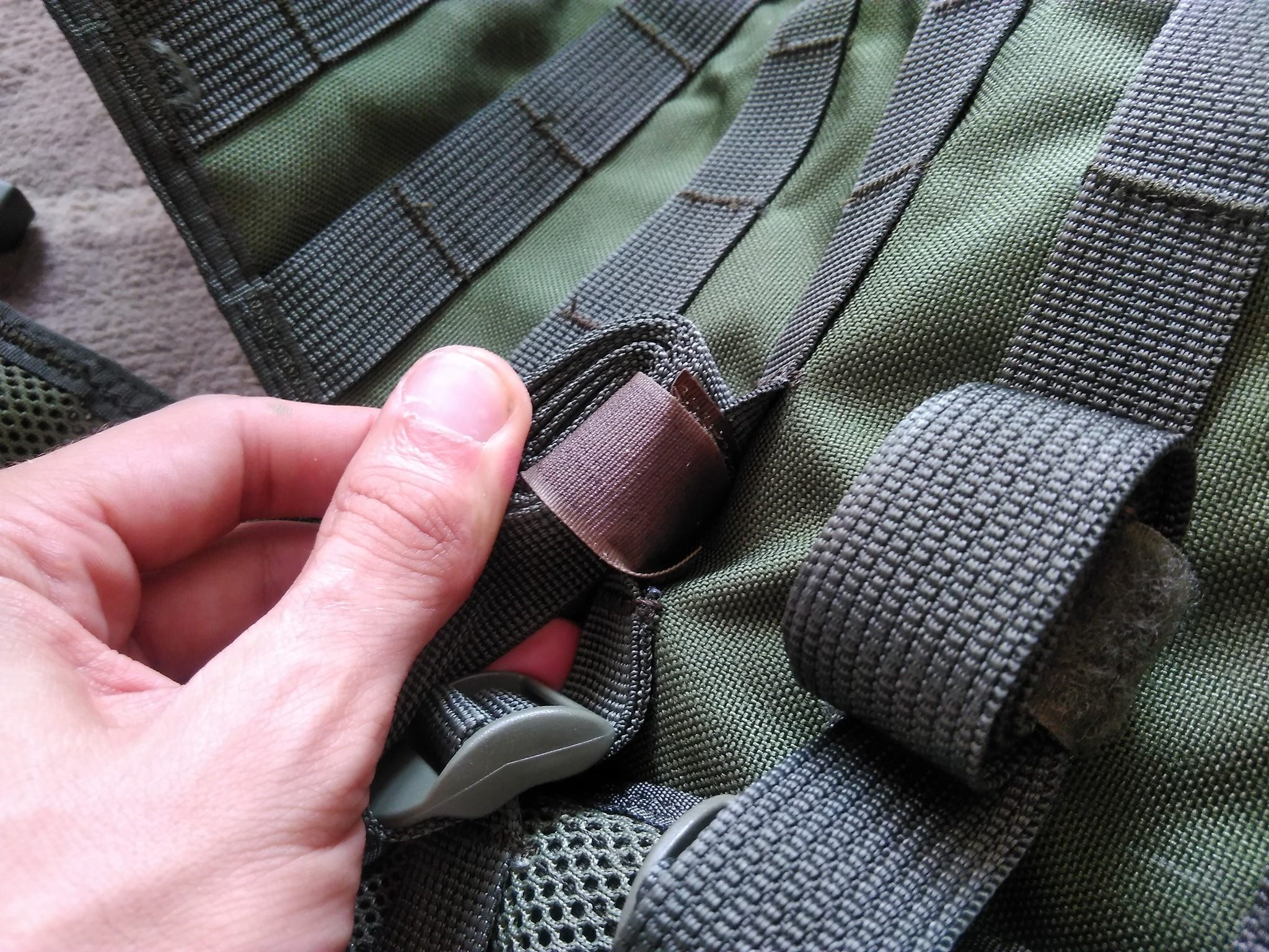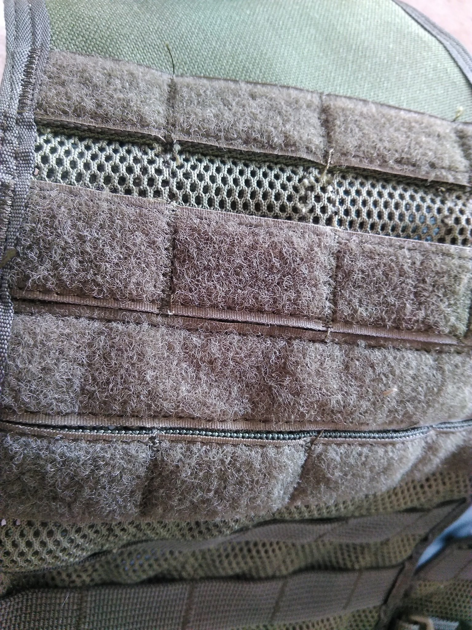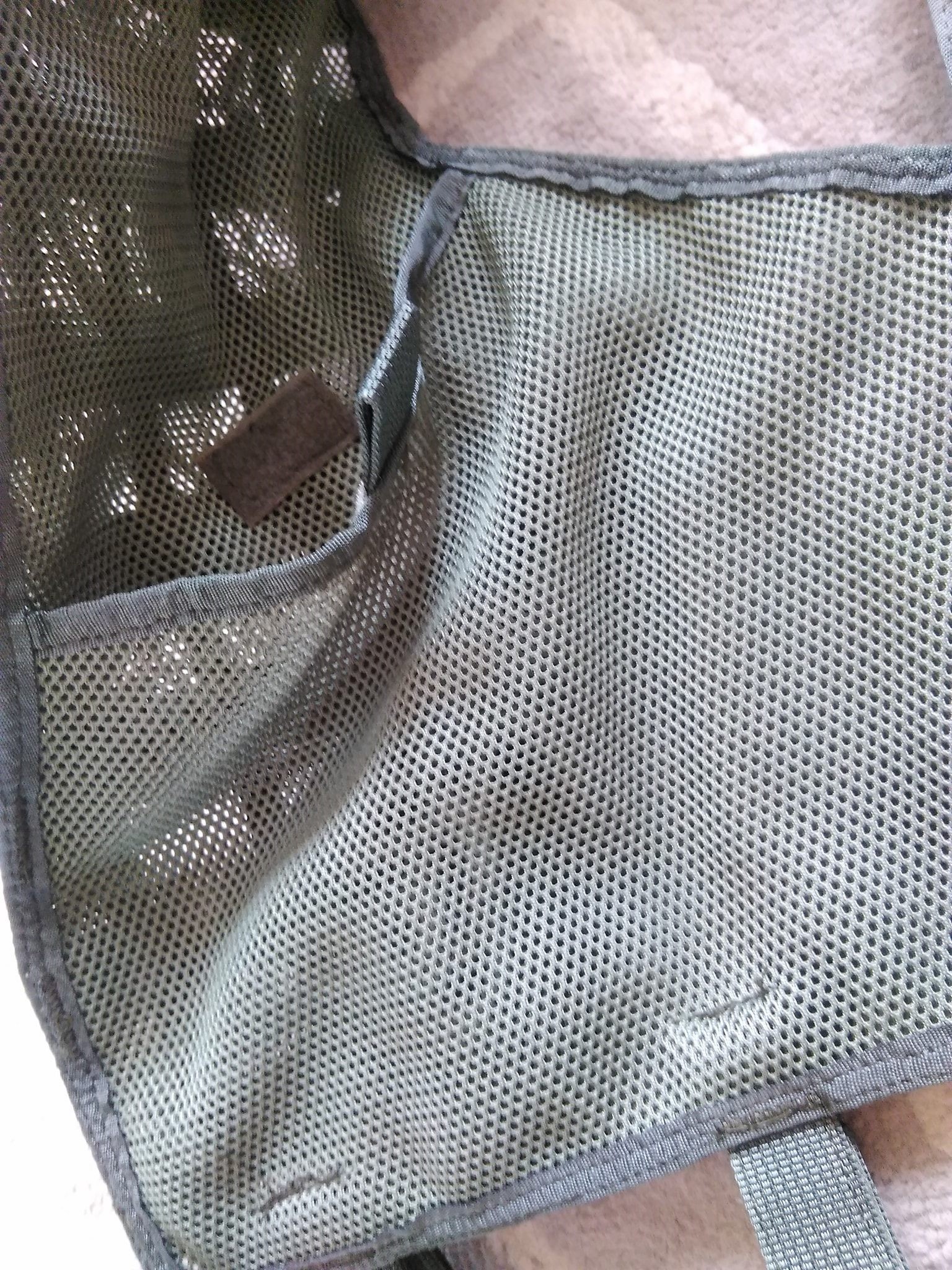 A teljes vállrész tépőzárakkal szabható méretre. A mellény így hossz irányban szépen állítható, habár a vállrész merevítése miatt nem túlzottan hajlékony. Az én esetemben (hogy nincs töltőanyag, vagyis testméret) eléggé bután állt rajtam a mellény. Ezen a részen már tépőzárakat tettek fel molle-hevederezés helyett. Itt szépen tudunk rögzíteni millióféle méretű, alakú azonosítót, felvarrót és egyéb nyalánkságot. Szintén ezen a vállrészen, mindkét oldalt D-gyűrű található, ezen is számos dolog rögzíthető - fegyverszíj, stb. A vállrészen keresztbe széles gumiszalag található, amely már foszlott, feslett módon érkezett hozzám - annak ellenére, hogy a mellény teljesen új volt. Ezen a gumiszalagon megkaptuk az oroszos érzést - a mellény látványa emiatt olyan, mintha használt lenne. Szintén ezen a vállrészen van két heveder karika, amely kivállóan használható az ivózsák "szívószálának" rögzítésére. A hát is rengeteg befűzési pontot kapott, majdnem a teljes felület fűzhető itt is. Ráadásul ide rejtettek egy méretes zsebet, amelyet tépőzár rögzít. Ide lövedékálló betét is helyezhető, de a magam esetében ivózsák került végül. Mint írtam, a hátrész is némileg merevítve van.